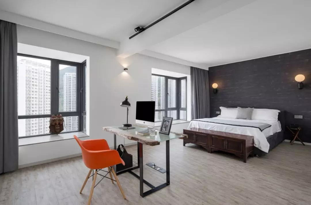 三房改造兩房,讓空間利用得更加清逸自如。臥室同樣承襲了LOFT工業風精簡、藝術的基因,感覺像是被雕刻著用刻刀剔除所有的不必要,簡約的天花,消除建筑建構給人的壓迫感。