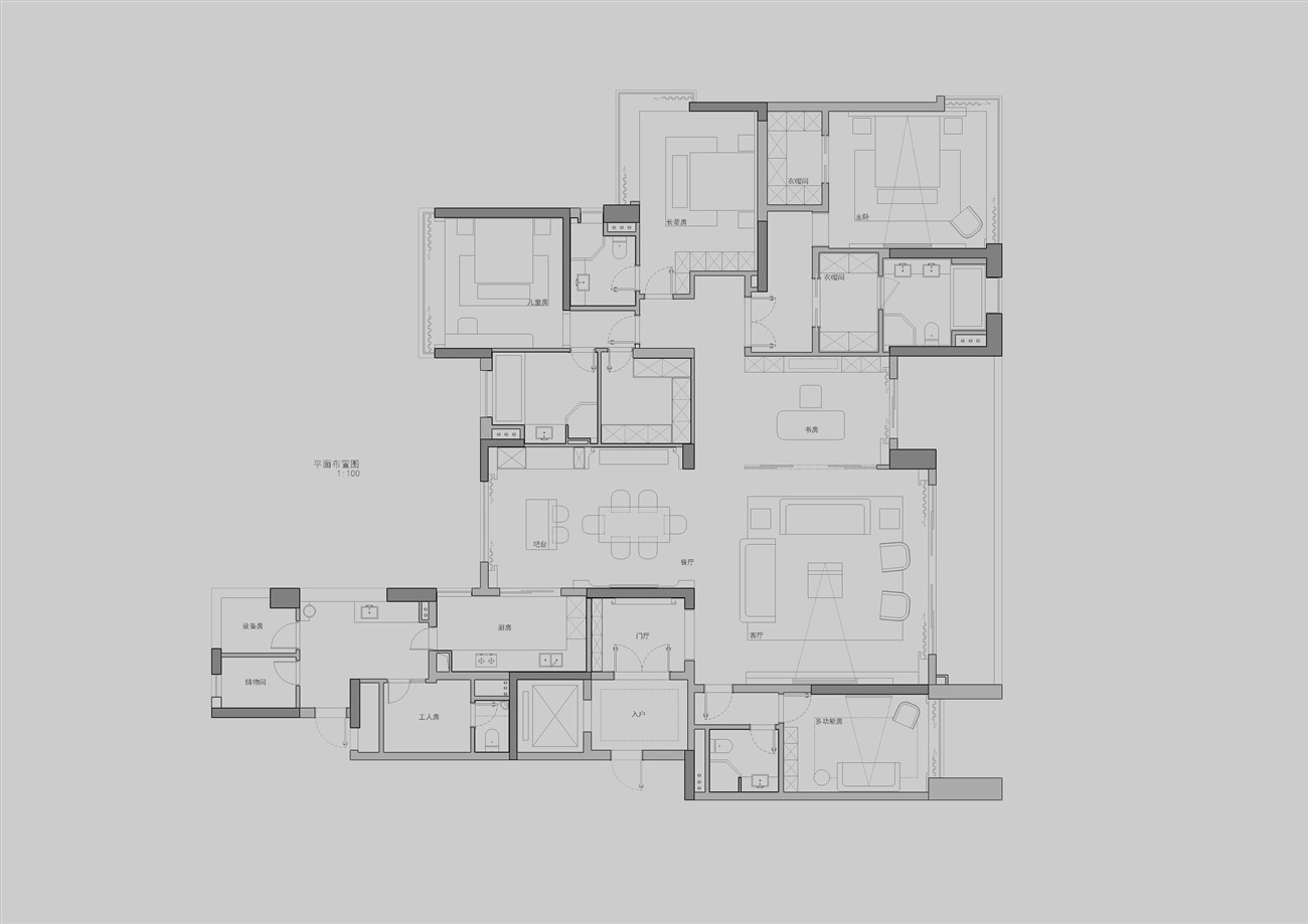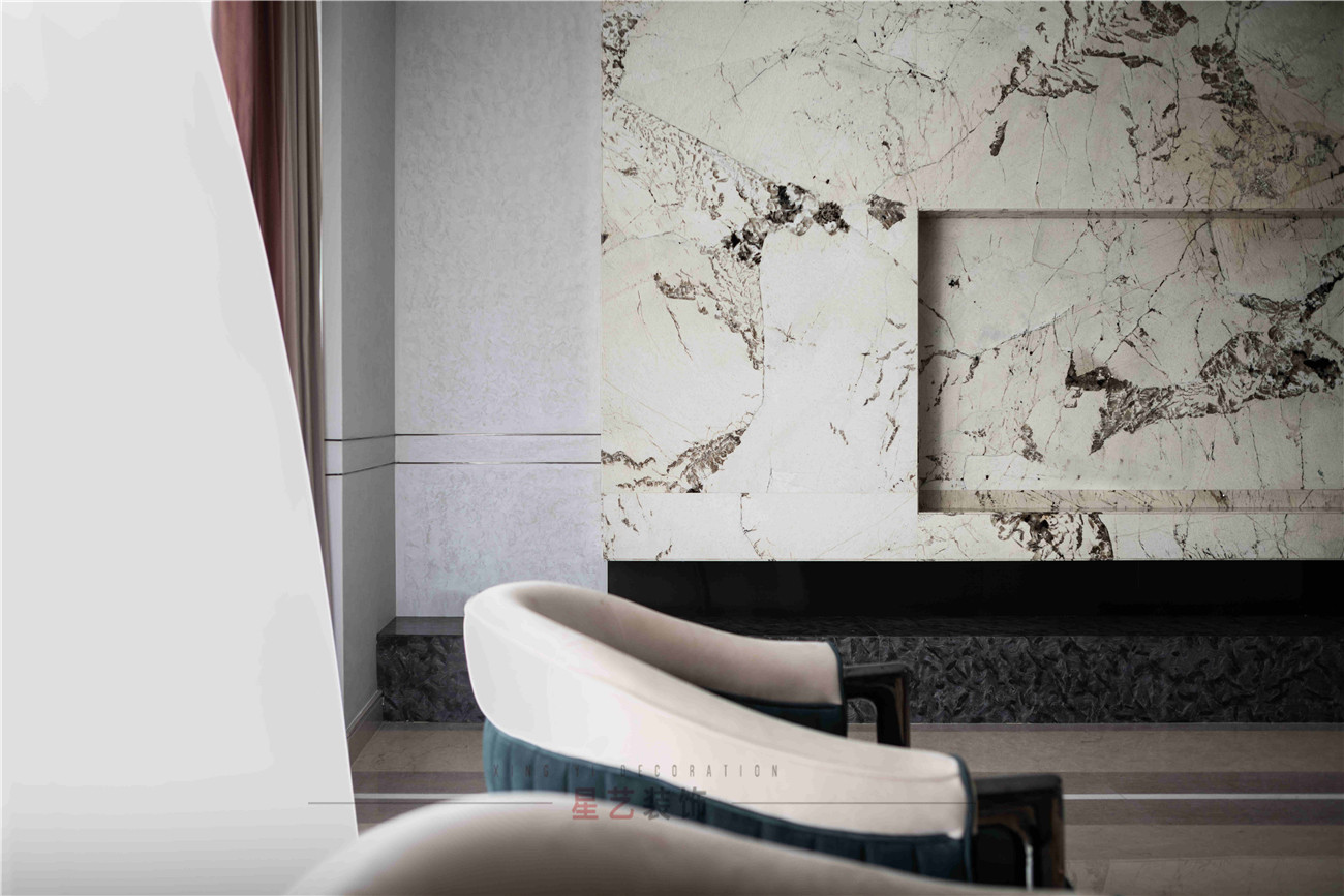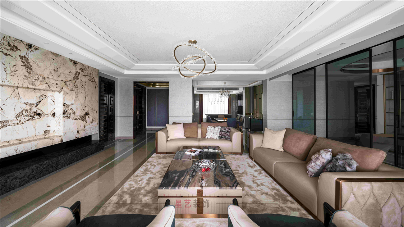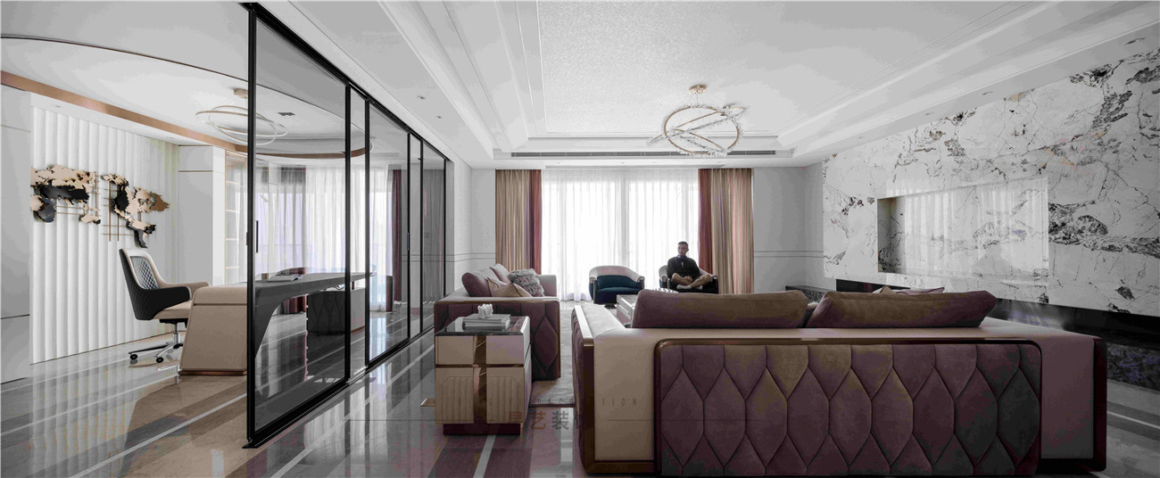本案設(shè)計(jì)是位于海珠區(qū)380㎡的住宅,擁有無敵景觀一視野,業(yè)主90后,準(zhǔn)備做婚房,要求輕奢,鐘愛石材,金屬和皮質(zhì)的家居風(fēng)格,敞開式書房通過隔斷可移動(dòng)屏風(fēng)于客戶區(qū)域串聯(lián)起來,可開可隔斷的靈動(dòng)組合,最大的強(qiáng)化空間包容及開闊性,用中西結(jié)合的方式為即將到來的婚姻生活帶來更高的幸福指數(shù),打造溫馨的生活環(huán)境。