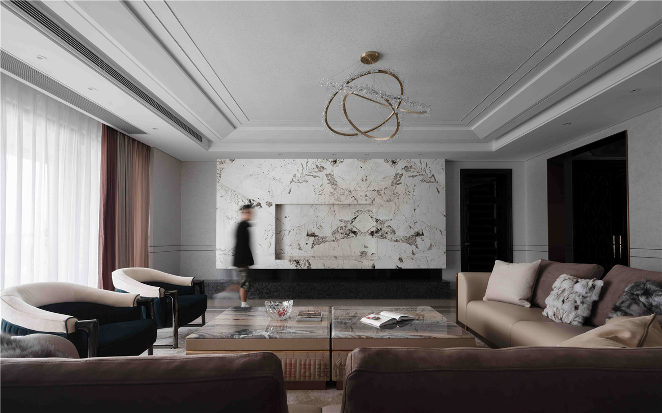 光滑有質(zhì)感的沙發(fā),搭配上同色系的矮桌讓整體的色調(diào)更加協(xié)調(diào),而且?guī)в谢⌒蔚纳钌q面座椅,和精心設(shè)計(jì)的圓形吊燈,打破了四四方方桌子和沙發(fā)帶來的頓感,如潑墨山水般的人大理石紋理給整個(gè)客廳增添奢華的格調(diào)。