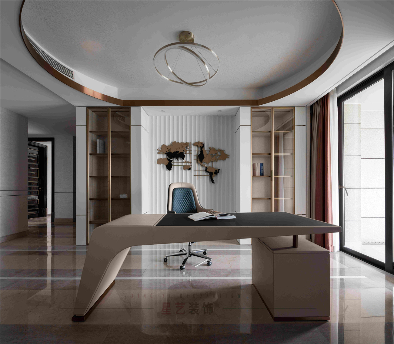 想要過上向往的生活,工作就顯得總是無處不在,辦公區(qū)是在家中辦公或者看書的地方。這樣充滿的科技感的辦公桌就備受年輕人的喜愛,尤其是跟客廳相呼應(yīng)的圓形吊燈和棕色邊框的修飾,直接把整體的時(shí)尚度拉滿,同時(shí)寬闊獨(dú)立的空間更是減緩了工作壓力帶來的壓迫感。
