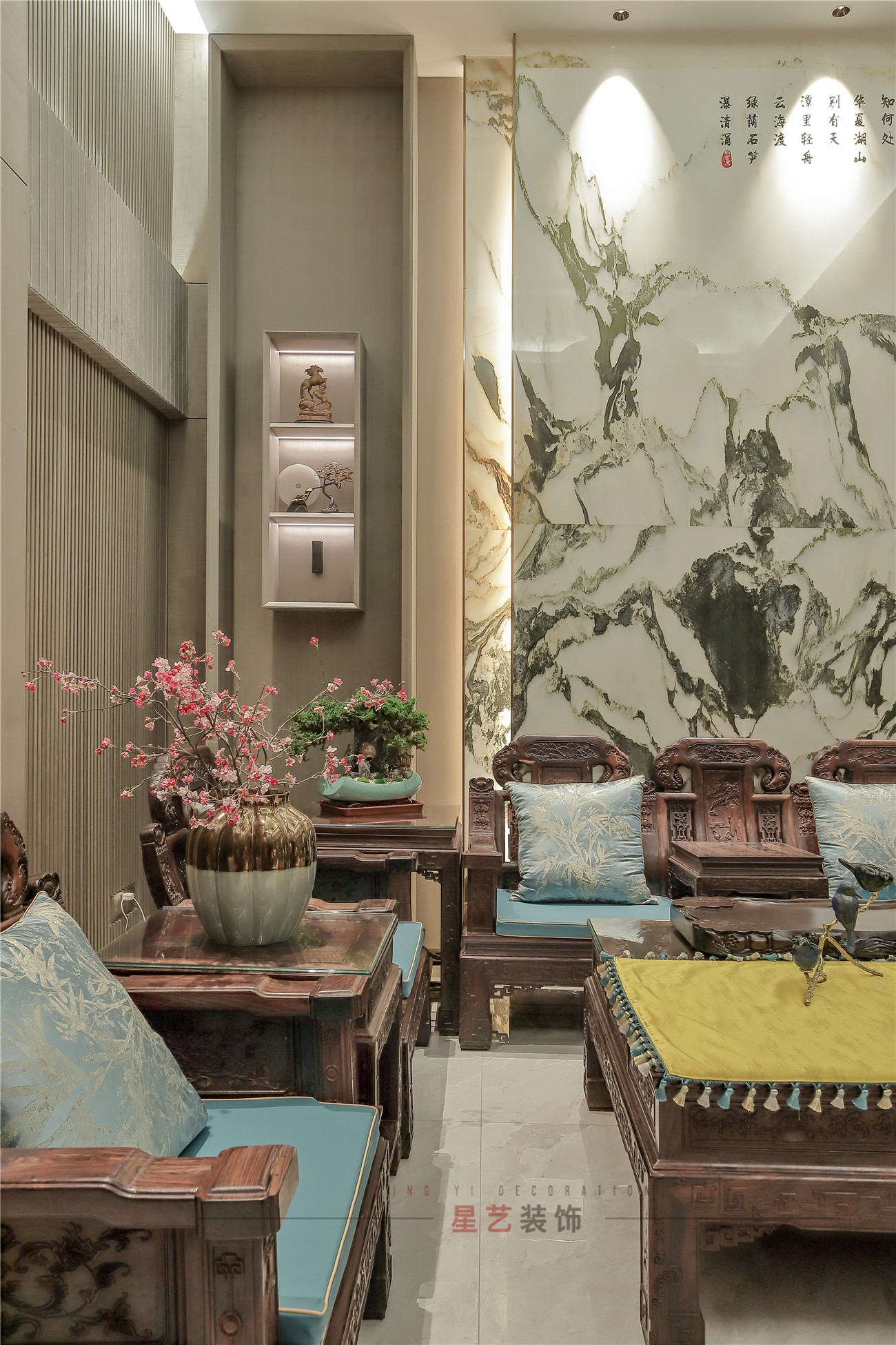 客廳采用古色古香的紅木家具,雕刻不繁復(fù),顏色不沉悶,整體端莊大氣,沉穩(wěn)時(shí)尚。尤其是水墨紋路的大理石墻面,提煉出古典元素的精髓,綠盆景更是讓整個(gè)設(shè)計(jì)提升了清幽雅致的風(fēng)水畫格調(diào)。