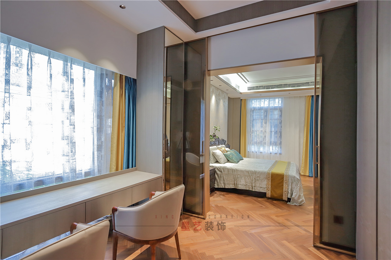 臥室用豐富的色彩搭配營(yíng)造了一個(gè)溫馨舒適的環(huán)境,若隱若現(xiàn)的山水背景墻和枝椏圖案仿佛處在春意盎然的環(huán)境中,感受自然的勃勃生機(jī)。旁邊就可以作為化妝間,屬于愛美女性的小天地。