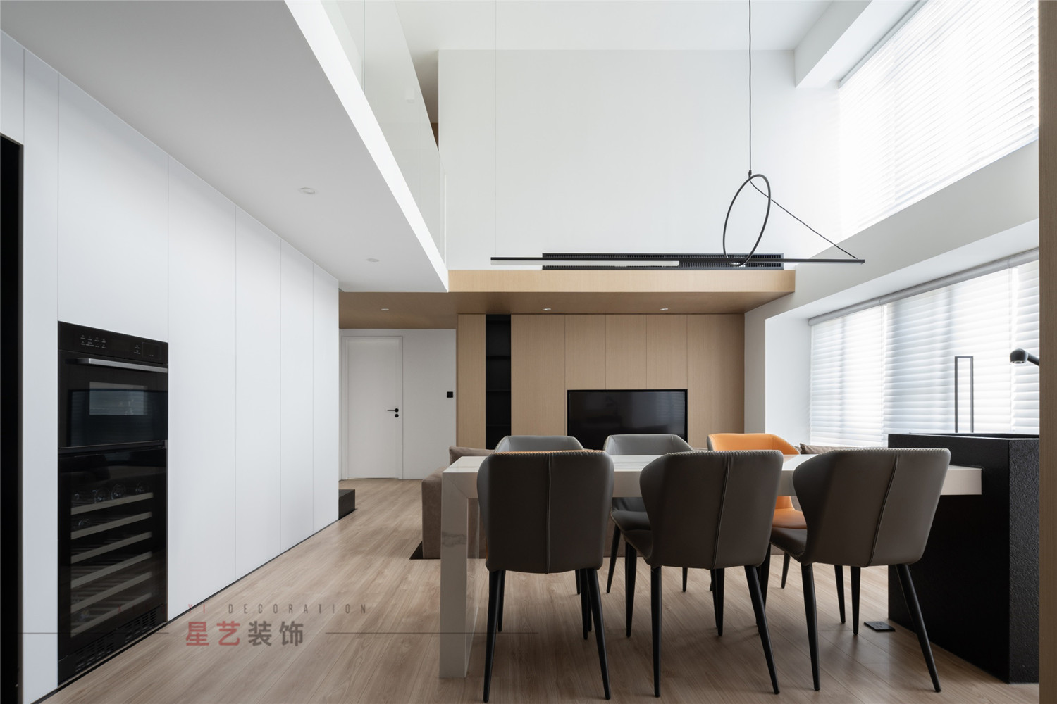 客廳:簡潔的設計,大面積的百葉窗制造極好的光影效果,不管任何天氣都擁有最佳的采光,內嵌的電視機搭配下沉式空間的處理手法帶給業主沉浸的舒適體驗,主色調黑白灰,在各個區域中都有獨立的對應系,精簡而規整,大方而得體。