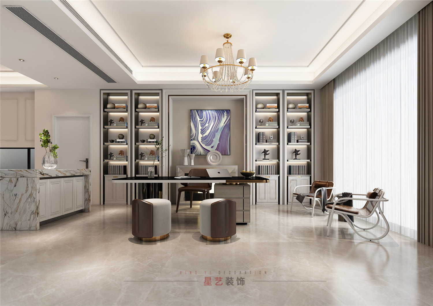 工作區(qū)靠近落地窗,光線充足。挖空墻面設(shè)計置物架,縮減空間又更加整體,并且端景的設(shè)計極具輕奢風(fēng)格。