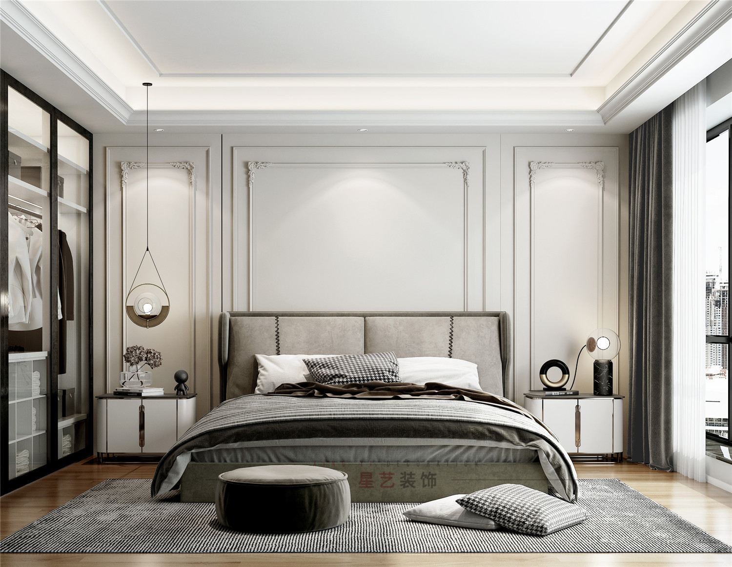 主臥用大面積灰調(diào)與對稱的設(shè)計,沉穩(wěn)高級。簡約之中,又有無盡的雅致與濃厚的生活氣息。