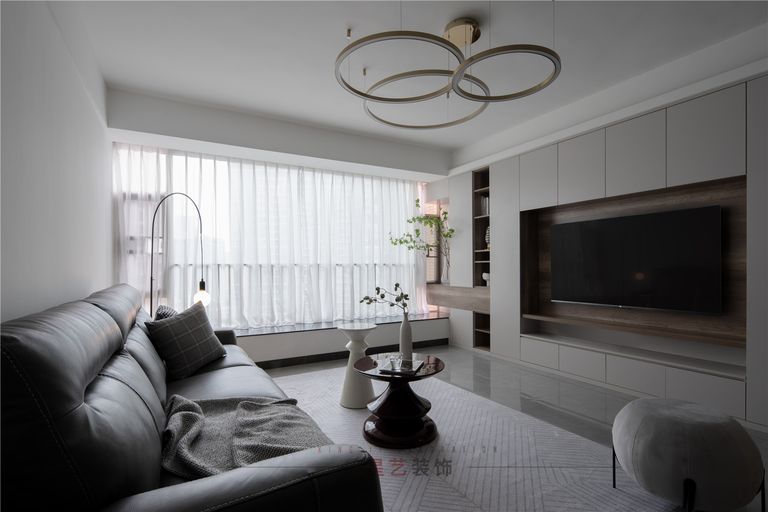 走進大門,迎面的光線穿過屏風給人一絲絲的柔和和神秘,客廳背景設計兼顧儲物和整體的空間提升,開放格的選擇尤為重要。