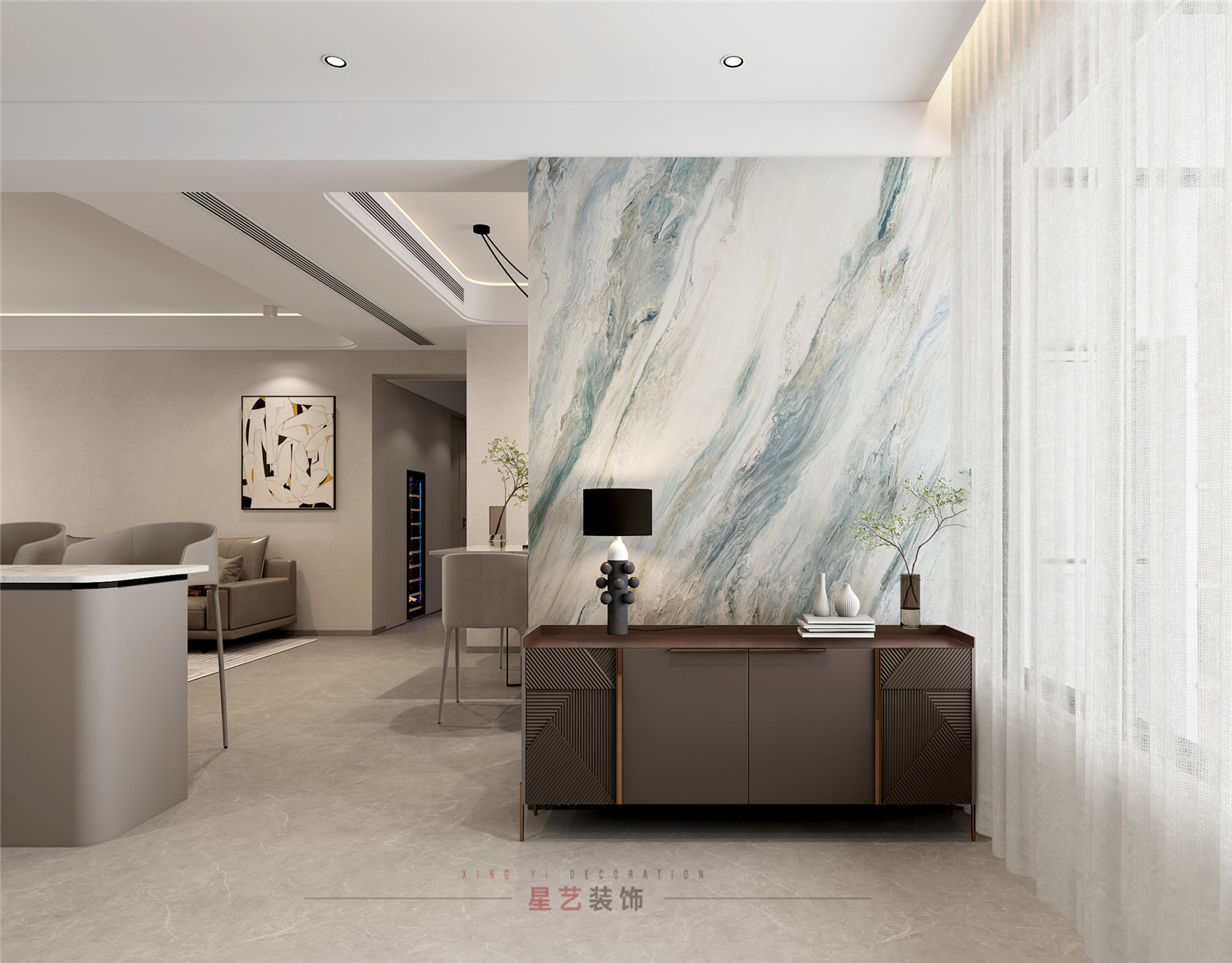 進入玄關,海潮般的大理石紋理映入眼簾, 結合深咖色亞克力櫥柜,一動一靜恰到好處,日光透過紗簾傾瀉而下,將世界囿于地面,靈動舒揚,捎來生活的囈語。