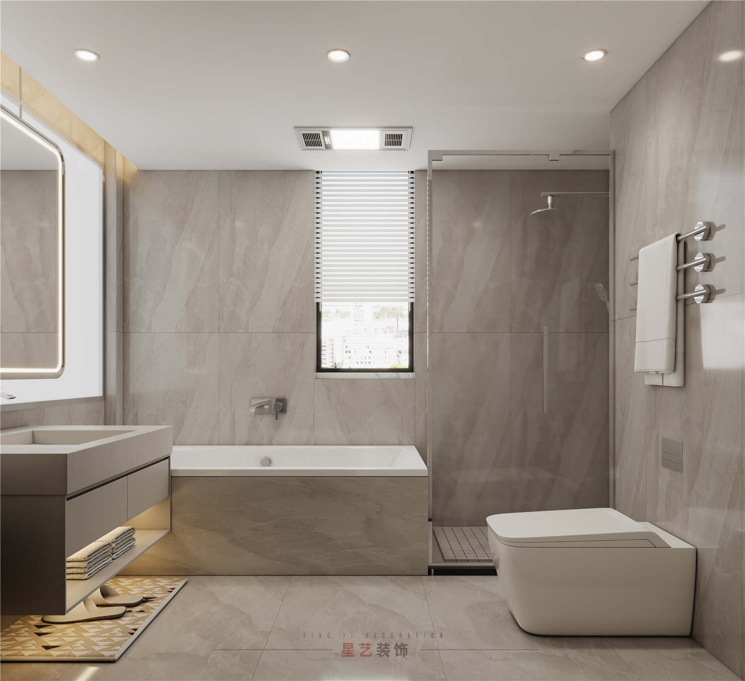 時尚的現代簡約衛生間,強調的是去繁留簡,合理劃分區域。墻面與地板瓷磚一致,以大理石紋為肌理,干凈大方,柔軟的亮堂潔凈感觸,一直也是呈現時髦簡約的好顏色調配。