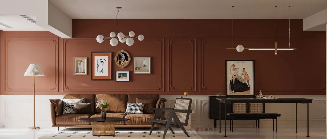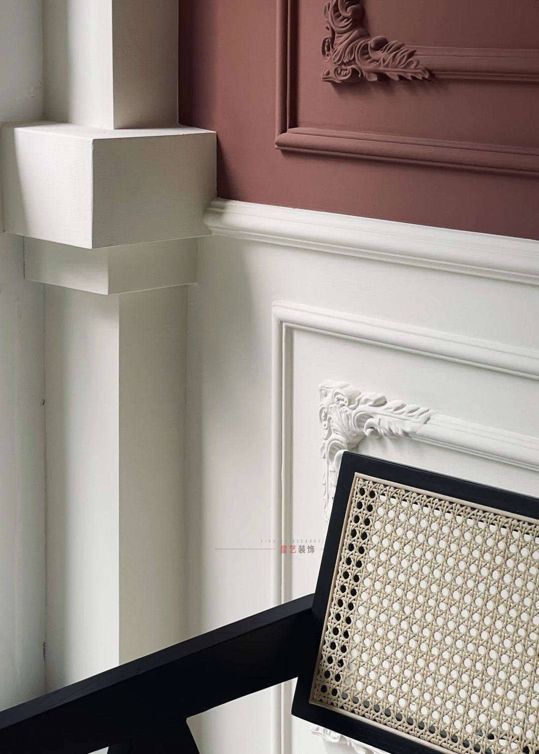 提到法式風格,就繞不開石膏線條元素,大開大放、如火如荼的大繎色塊游走整個客餐區(qū),毫不遮掩展示了主人熱情的性格,同時達到了延伸、整合的作用。