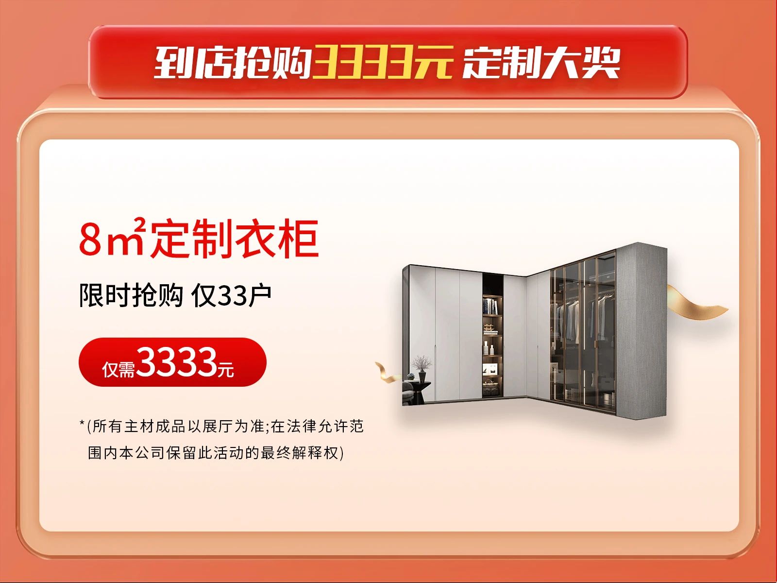 為慶祝星藝33周年活動,現推出3333元搶購8㎡定制衣柜,限時限量,有裝修需求的小伙伴抓緊時間啦!